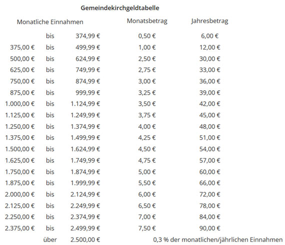 an dieser Stelle darf ich mich im Namen des Gemeindekirchenrates bei allen bedanken, die ihre Kirchengemeinde mit ihrem Gemeindekirchgeld unterstützt haben. Wie Sie wissen, erbitten wir einmal im Jahr von allen, die keine Kirchensteuer zahlen, ein Gemeindekirch-geld, dass gestaffelt ist nach den monatlichen Einkünften. Aber darum geht es mir nicht. Das Kirchgeld ist freiwillig, alles andere ist nur eine Empfehlung, dass man, so man will, einen Anhaltspunkt hat. Diesen Anhaltspunkt ersehen Sie unten in der Tabelle.